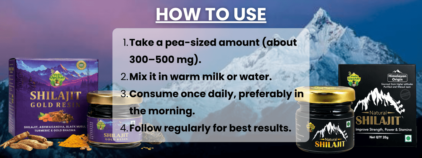 Take a pea-sized portion of resin (about 300–500 mg). Dissolve in lukewarm water or milk. Consume once or twice daily, preferably on an empty stomach. Start with a smaller amount if you are new to shilajit and increase as tolerated.